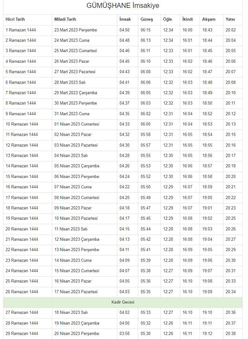 İŞTE 2023 GÜMÜŞHANE İMSAKİYESİ