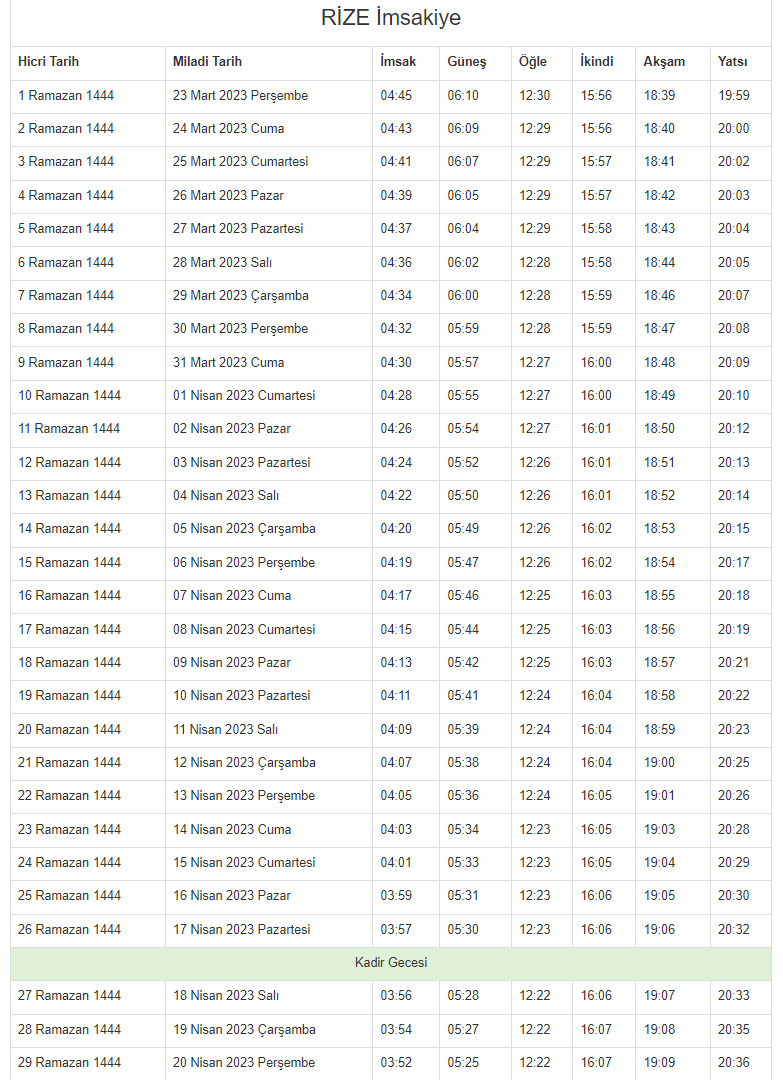 İslam Alemi tarafından çok önemli bir yere sahip olan 11 Ayın Sultanı Ramazan ayı geldi. Her Ramazan’da olduğu gibi insanlar Sahur ve İftar saatlerini merak ediyor. 2023 Rize İmsakiyesi – Rize'de sahur ve iftar saat kaçta? Bütün ayrıntılar Haberimizde…
