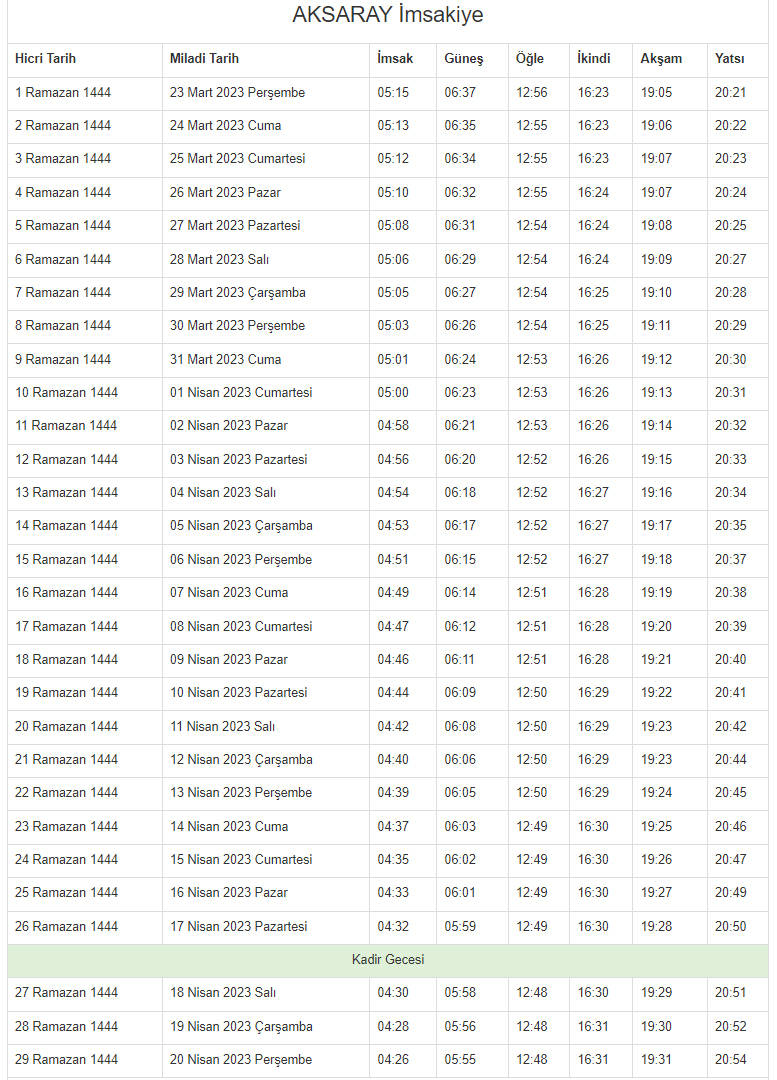 İŞTE 2023 AKSARAY İMSAKİYESİ