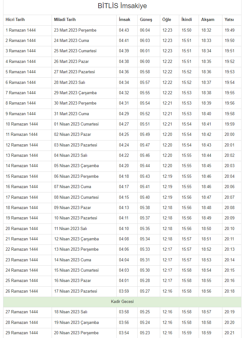 İŞTE 2023 BİTLİS İMSAKİYESİ