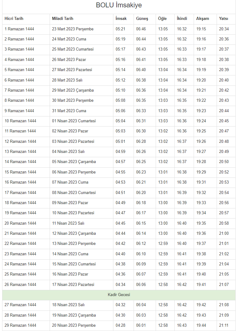 İslam Alemi tarafından çok önemli bir yere sahip olan 11 Ayın Sultanı Ramazan ayı geldi. Her Ramazan’da olduğu gibi insanlar Sahur ve İftar saatlerini merak ediyor. 2023 Bolu İmsakiyesi – Bolu’da sahur ve iftar saat kaçta? Bütün ayrıntılar Haberimizde…