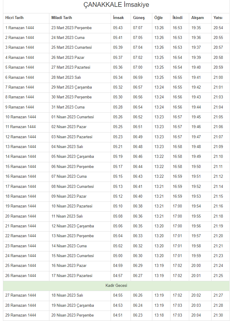 İŞTE 2023 ÇANAKKALE İMSAKİYESİ