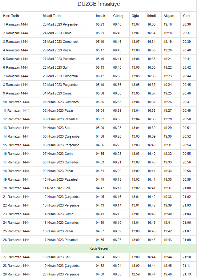 İşte 2023 Düzce imsakiyesi