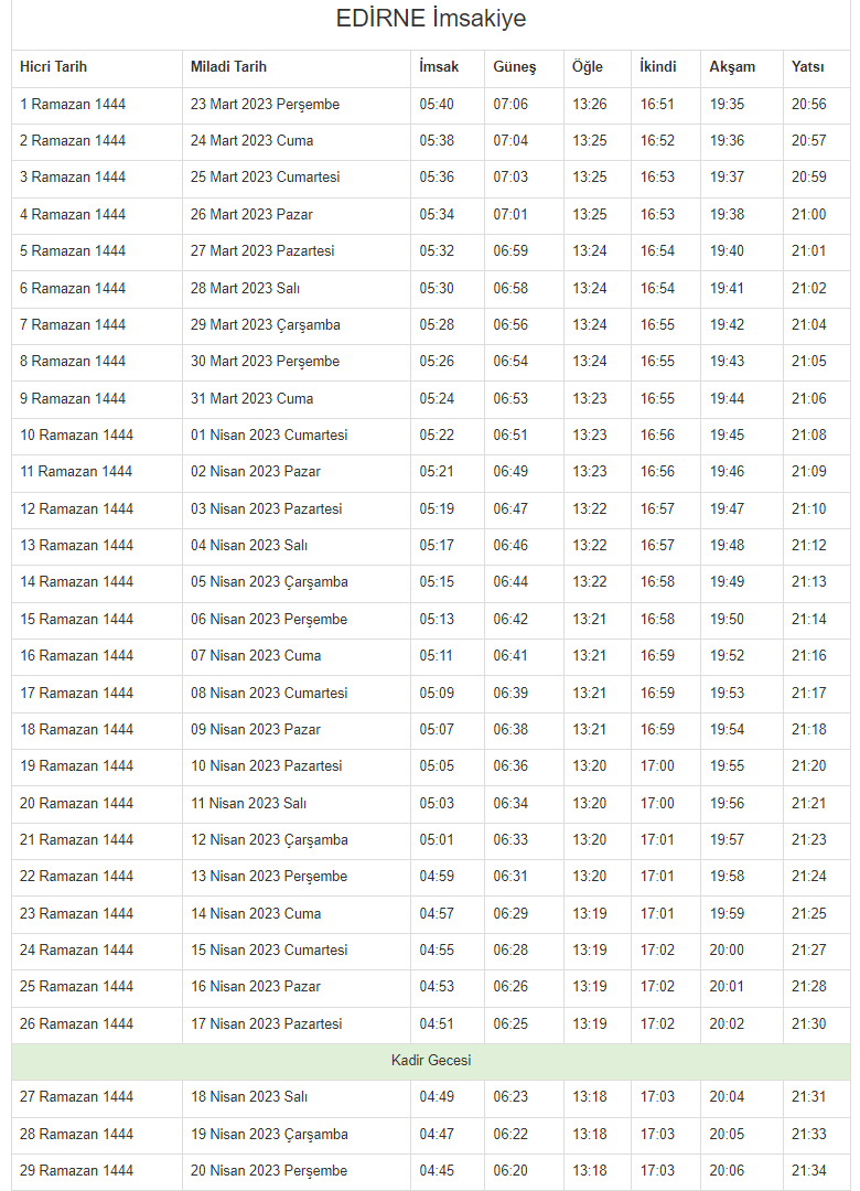 İŞTE 2023 EDİRNE İMSAKİYESİ