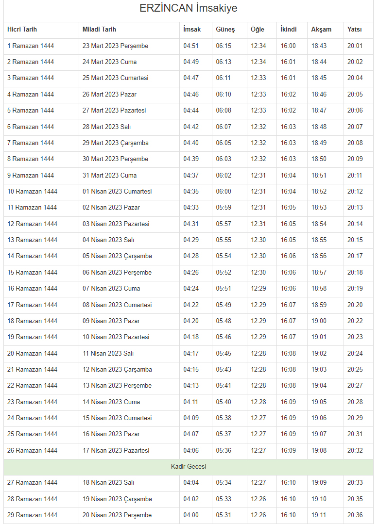 İŞTE 2023 ERZİNCAN İMSAKİYESİ