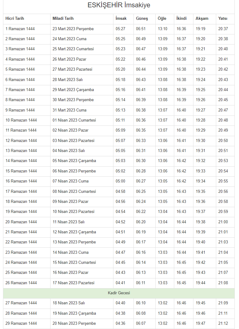 İŞTE 2023 ESKİŞEHİR İMSAKİYESİ