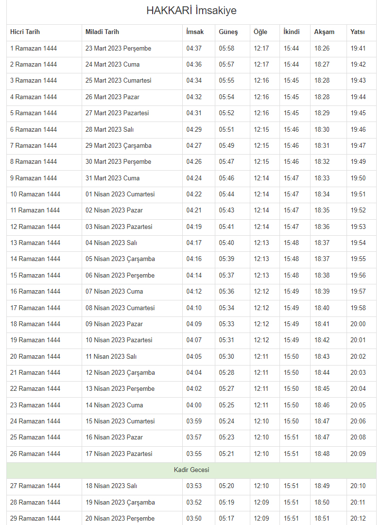 İŞTE 2023 HAKKARİ İMSAKİYESİ