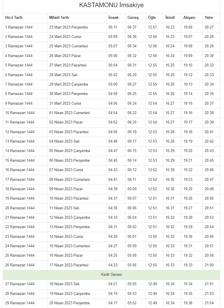 İŞTE 2023 KASTAMONU İMSAKİYESİ