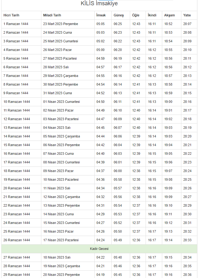 İslam Alemi tarafından çok önemli bir yere sahip olan 11 Ayın Sultanı Ramazan ayı geldi. Her Ramazan’da olduğu gibi insanlar Sahur ve İftar saatlerini merak ediyor. 2023 Kilis İmsakiyesi – Kilis'te sahur ve iftar saat kaçta? Bütün ayrıntılar Haberimizde…