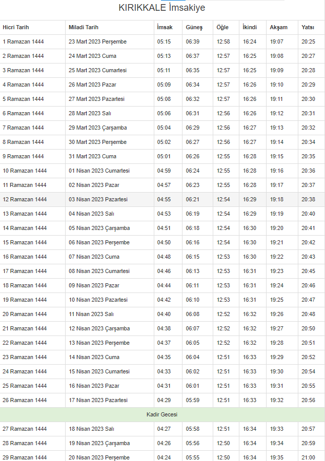 İslam Alemi tarafından çok önemli bir yere sahip olan 11 Ayın Sultanı Ramazan ayı geldi. Her Ramazan’da olduğu gibi insanlar Sahur ve İftar saatlerini merak ediyor. 2023 Kırıkkale İmsakiyesi – Kırıkkale'de sahur ve iftar saat kaçta? Bütün ayrıntılar Haberimizde…