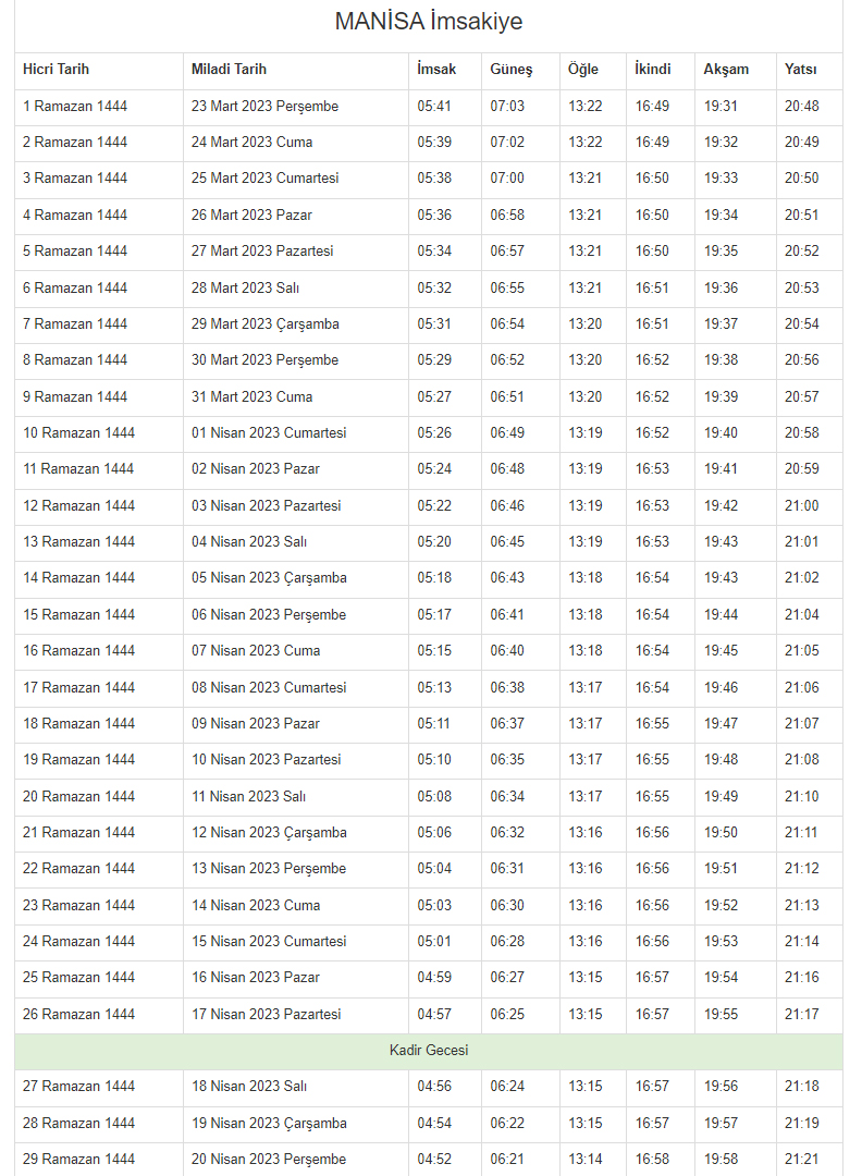 İŞTE 2023 MANİSA İMSAKİYESİ