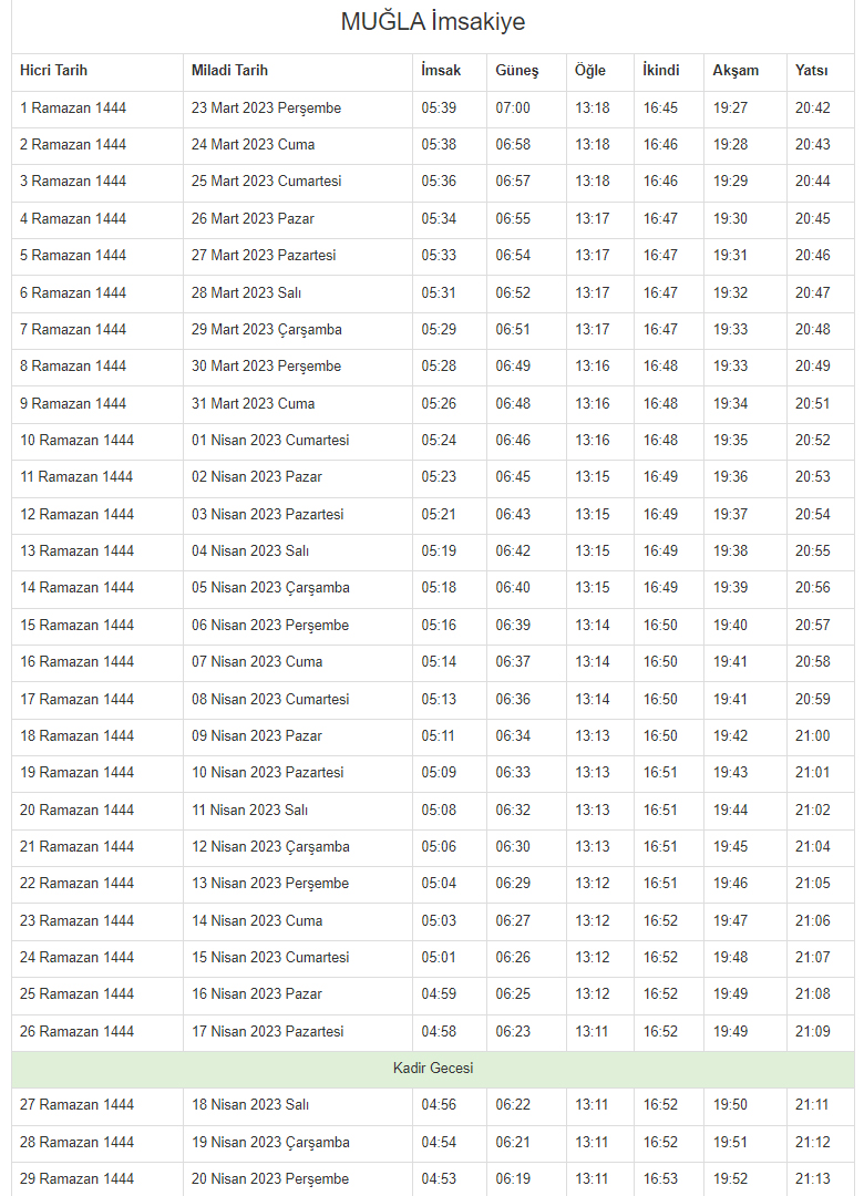 İŞTE 2023 MUĞLA İMSAKİYESİ