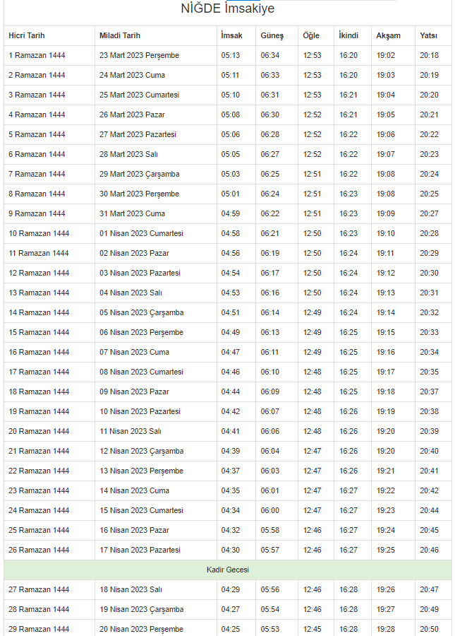 İşte 2023 Niğde imsakiyesi