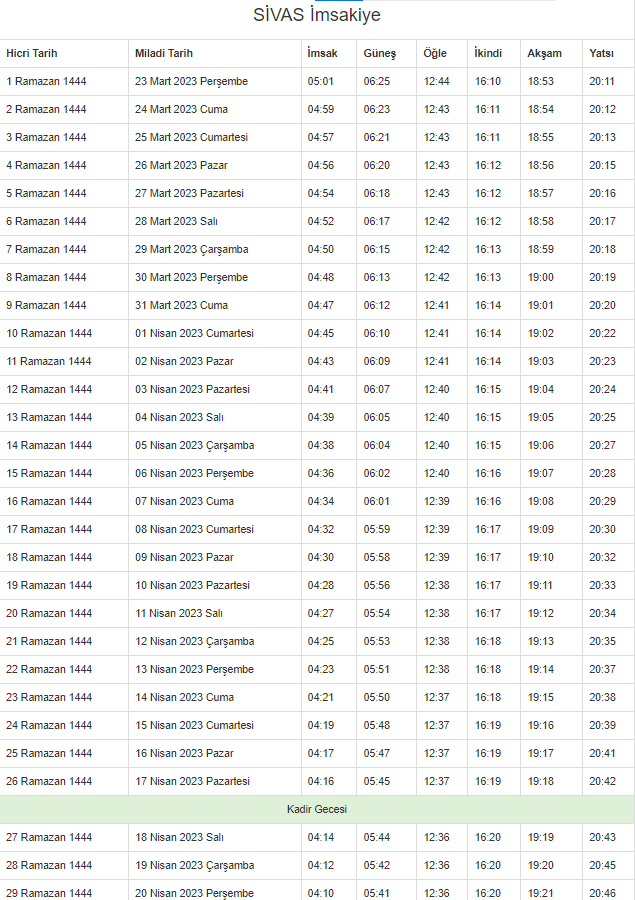 İslam Alemi tarafından çok önemli bir yere sahip olan 11 Ayın Sultanı Ramazan ayı geldi. Her Ramazan’da olduğu gibi insanlar Sahur ve İftar saatlerini merak ediyor. 2023 Sivas İmsakiyesi – Sivas'ta sahur ve iftar saat kaçta? Bütün ayrıntılar Haberimizde…