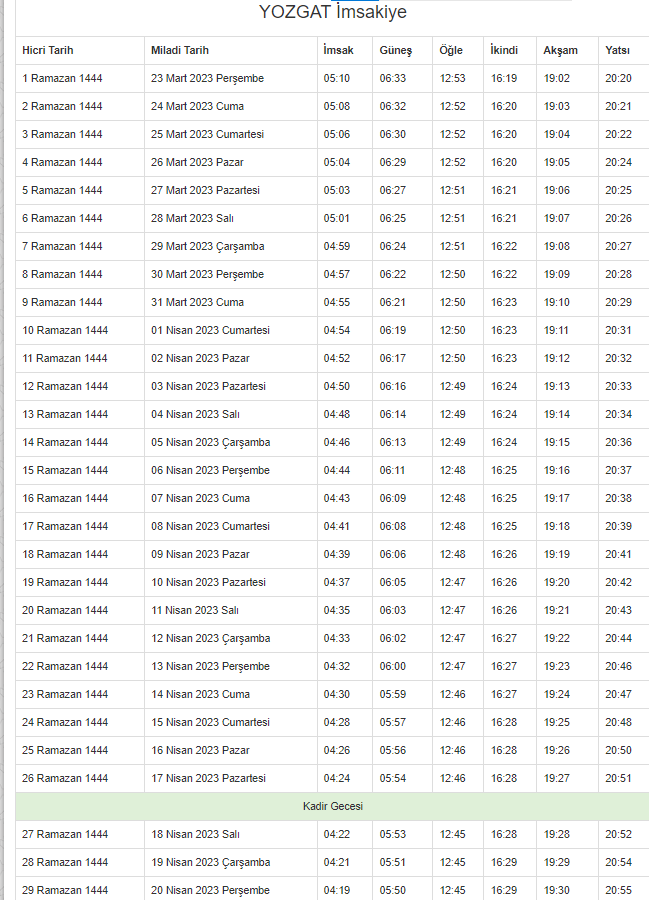 İslam Alemi tarafından çok önemli bir yere sahip olan 11 Ayın Sultanı Ramazan ayı geldi. Her Ramazan’da olduğu gibi insanlar Sahur ve İftar saatlerini merak ediyor. 2023 Yozgat İmsakiyesi – Yozgat'ta sahur ve iftar saat kaçta? Bütün ayrıntılar Haberimizde…
