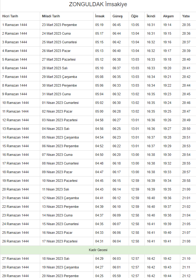 İslam Alemi tarafından çok önemli bir yere sahip olan 11 Ayın Sultanı Ramazan ayı geldi. Her Ramazan’da olduğu gibi insanlar Sahur ve İftar saatlerini merak ediyor. 2023 Zonguldak İmsakiyesi – Zonguldak 'da sahur ve iftar saat kaçta? Bütün ayrıntılar Haberimizde…