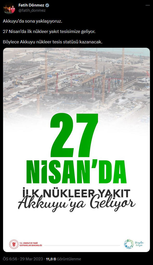 Enerji ve Tabii Kaynaklar Bakanı Fatih Dönmez, 27 Nisan'da ilk nükleer yakıtın Akkuyu'ya geleceğini duyurdu.