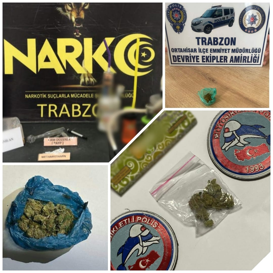 17-19.04.2023 tarihleri arasında Narkotik Suçlarla Mücadele Şube Müdürlüğü, Asayiş Şube Müdürlüğü Motosikletli Polis Timleri, Ortahisar İlçe Emniyet Müdürlüğü Devriye Ekipler Amirliği tarafından düzenlenen operasyonda 5,47 gram kubar esrar maddesi, bir miktar metamfetamin maddesi, bir miktar bonzai maddesi, 9 adet uyuşturucu kullanımına yarayan düzenek ele geçirildi.
