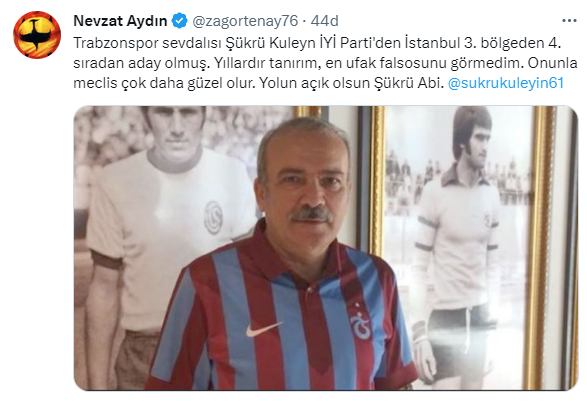 "Trabzonspor sevdalısı Şükrü Kuleyin İYİ Parti'den İstanbul 3. bölgeden 4. sıradan aday olmuş. Yıllardır tanırım, en ufak falsosunu görmedim. Onunla meclis çok daha güzel olur. Yolun açık olsun Şükrü Abi"